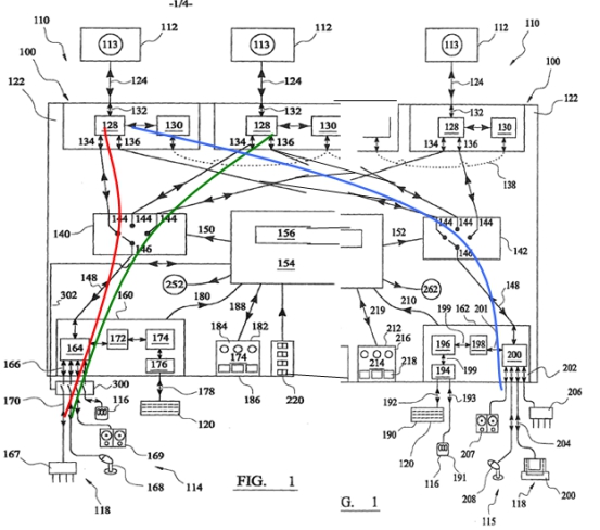 请求人认为:D1公开了设置于USB切换设备100内部的USB切换装置140、142(两个切换装置对应于涉案专利的特征E的切换装置),并且,在切换装置142保持与最左侧计算机122以及外围设备207连通的情况下(即第二(蓝色)通道不中断数据流),所述切换器140可以通过向下游连接146在最左侧向上游连接144(即第一(红色)通道)和中间向上游连接144(即第三(绿色)通道)之间切换。