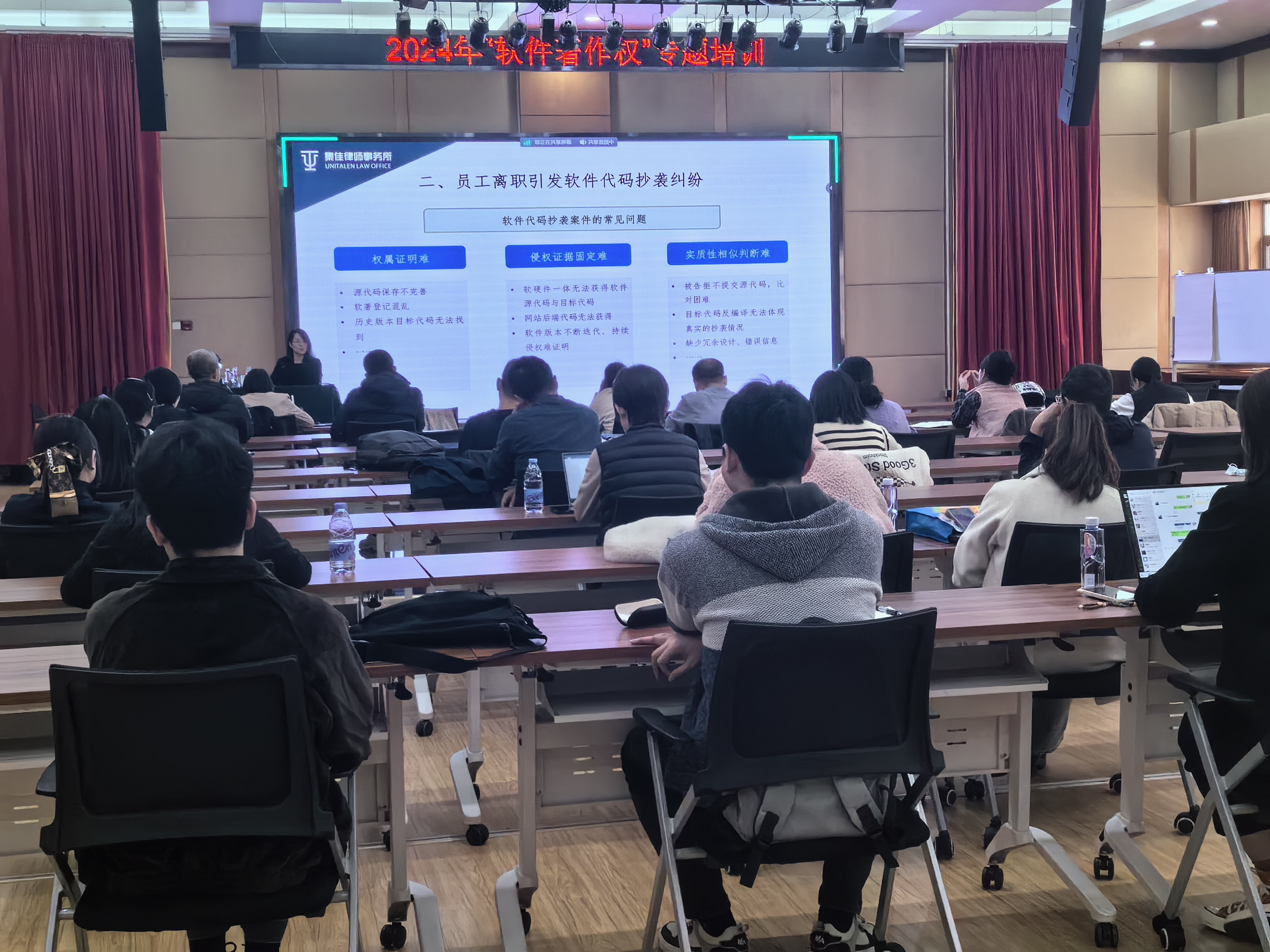 近日,集佳合伙人律师周丹丹、律师曹阳应邀为同方威视软件研发人员提供“2024年软件著作权专题培训”。周丹丹律师在铺垫了软件著作权保护的条件、软件著作权纠纷案件类型等相关基本法律知识的基础上,结合“宝利通诉小鱼易连案”等典型案例,对各类型案件中如何举证及法院认定进行了详细解读;进而以案例为引,总结提炼软件著作权登记的注意事项,源代码保护及权利软件使用证据沉淀,软件开发合同、合作开发合同中涉及权利归属约定、开发需求明确、交付等核心条款如何约定,软件采购及合规使用等方面的实务要点,为研发人员日常工作中可能遇到的软件相关问题答疑解惑。曹阳律师结合罗盒诉玩友案,分享了开源软件合规使用相关要点。