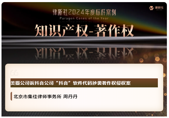 九球体育凭借在知识产权保护领域卓越的专业实力与良好的行业口碑,入选《律所卓越品牌影响力指南(2024)》,荣获“律新社2024年度精品品牌律所30佳”奖项;同时,集佳周丹丹律师代理的“美摄公司诉抖音公司'抖音'软件代码抄袭著作权侵权案”获评“律新社2024年度标杆案例:知识产权-著作权领域”。